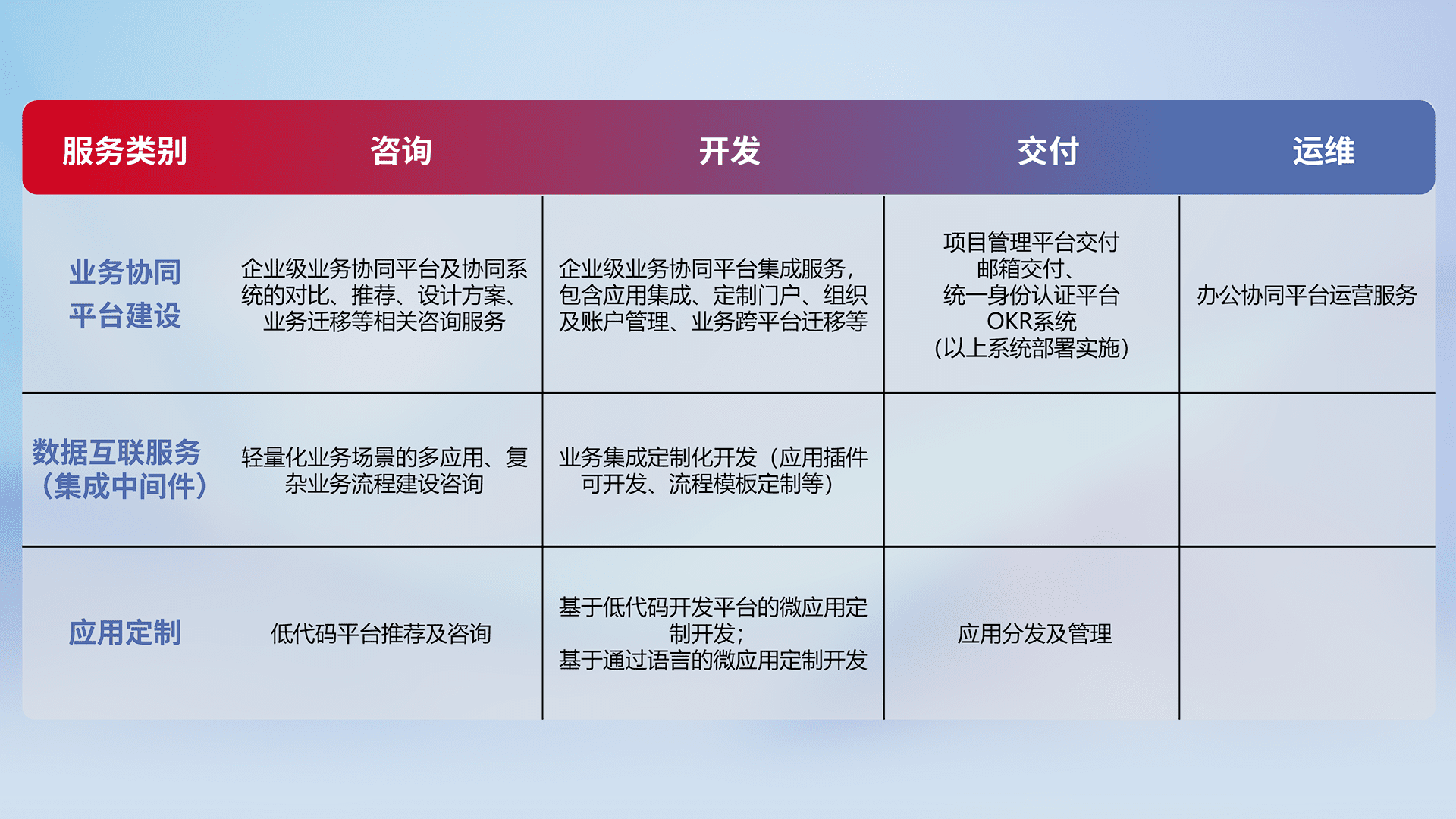 针对钉钉、、、企微、、、IDaas等平台级产品提供产品的规划、、方案、、交付、、、、定制化开发等服务,,,实现如统一协同办公、、智能客户服务、、混合会议管理、、智能数据查询、、、、等业务场景,,实现数字化转型。。。